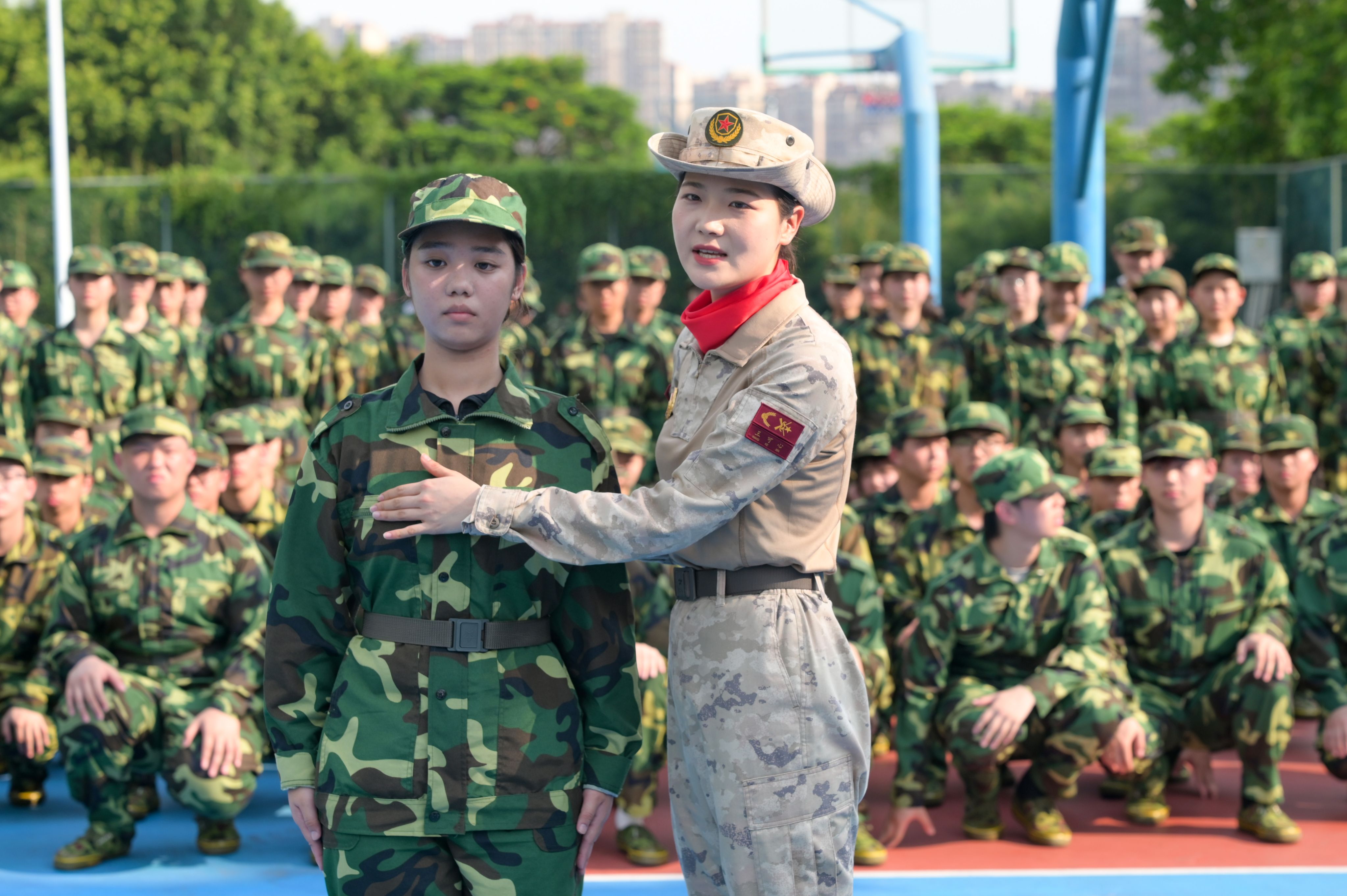 盛夏的酷热对新生体能与意志发起严峻挑战,部分分列式队员长时间训练后出现动作走样、耐力下滑的现象,但大家相互鼓励、咬牙坚持,传承着坚韧不拔的精神。教官们更是全程倾注了无数心血,他们不仅耐心细致地指导每一个动作,还巧妙地调整训练节奏,开展趣味横生的动员活动,有效缓解了新生的疲惫,进一步强化了团队的凝聚力。