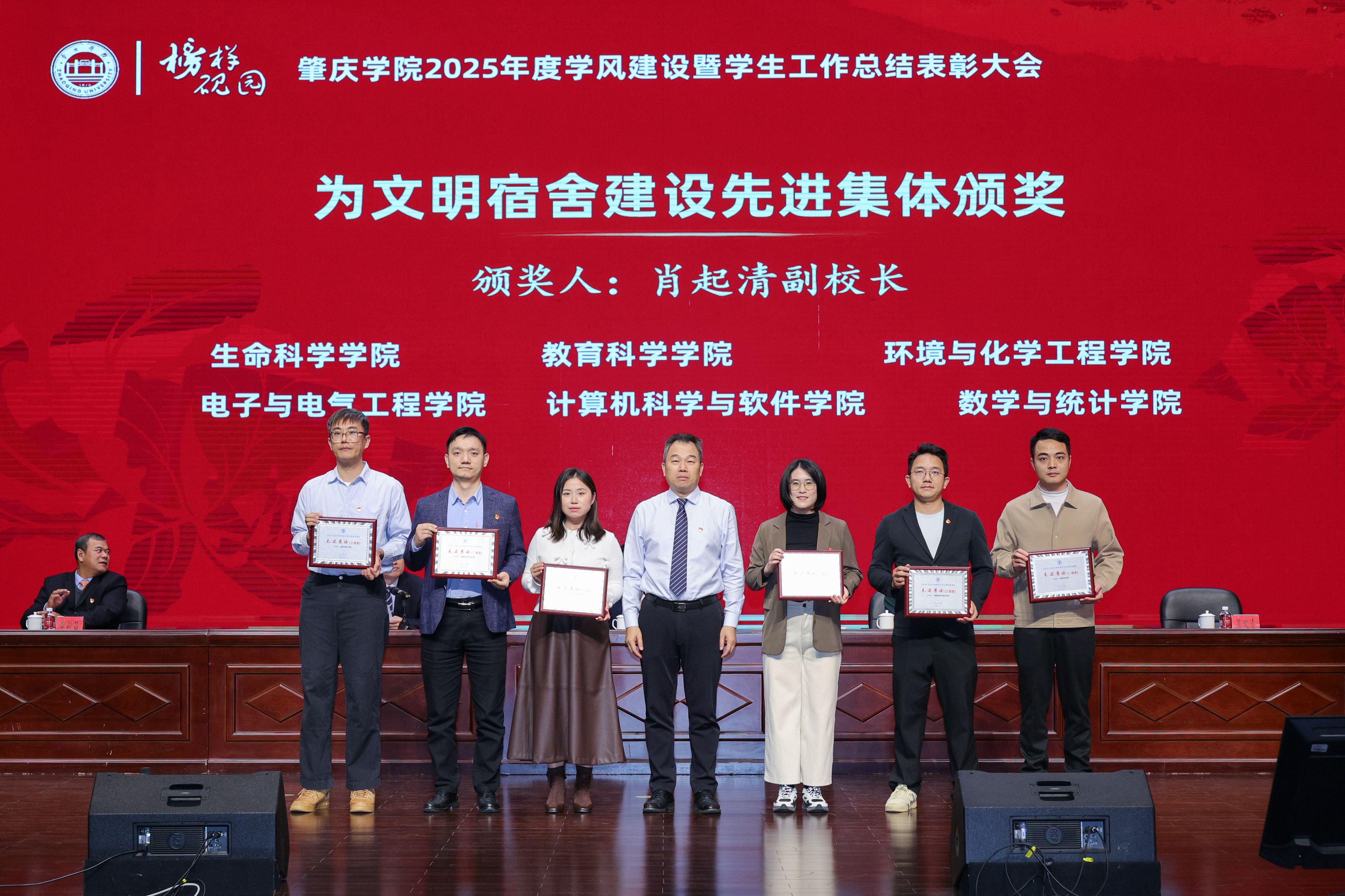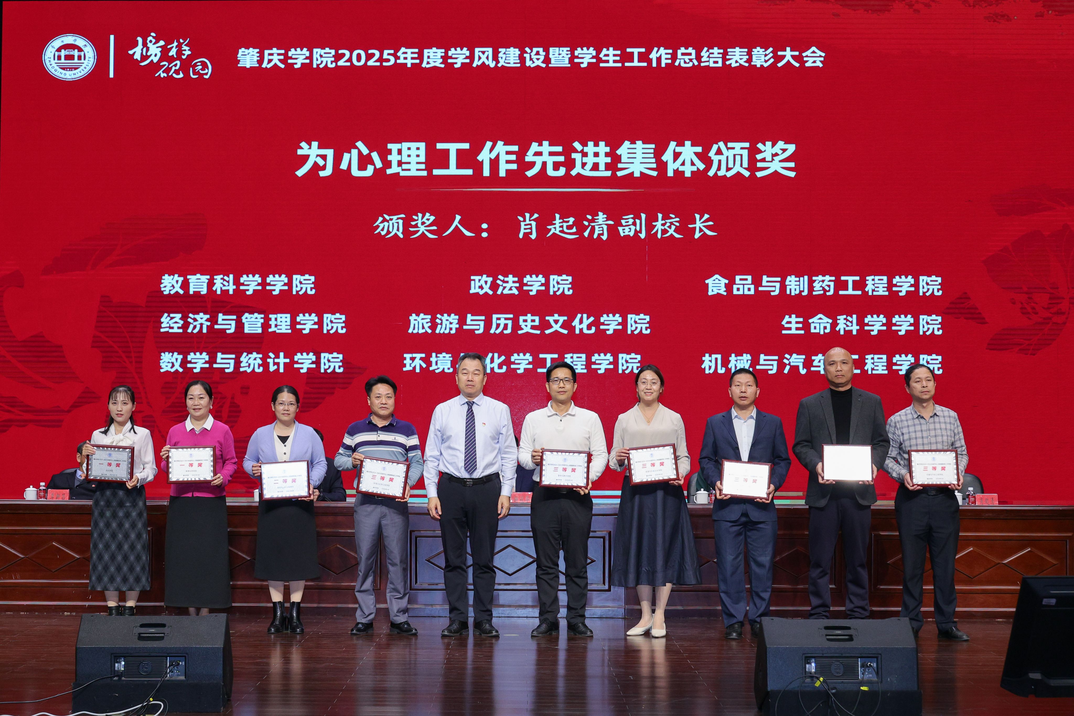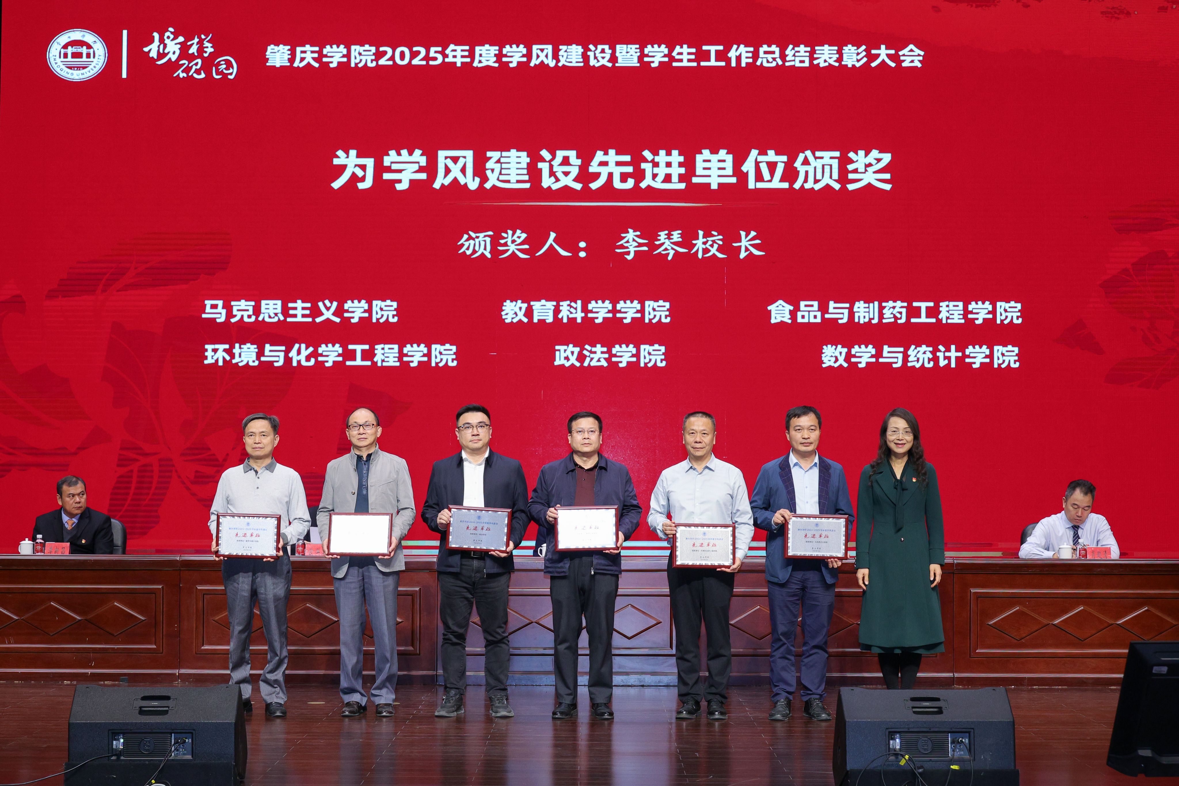 近日,肇庆学院举行2025年度学风建设暨学生工作表彰大会。环境与化学工程学院凭借扎实的工作作风和突出的育人成效,一举斩获心理先进工作集体、学风建设先进集体、文明宿舍先进集体和就业工作先进集体四项荣誉称号,成为本年度获奖项目最多、工作覆盖最全面的学院之一。