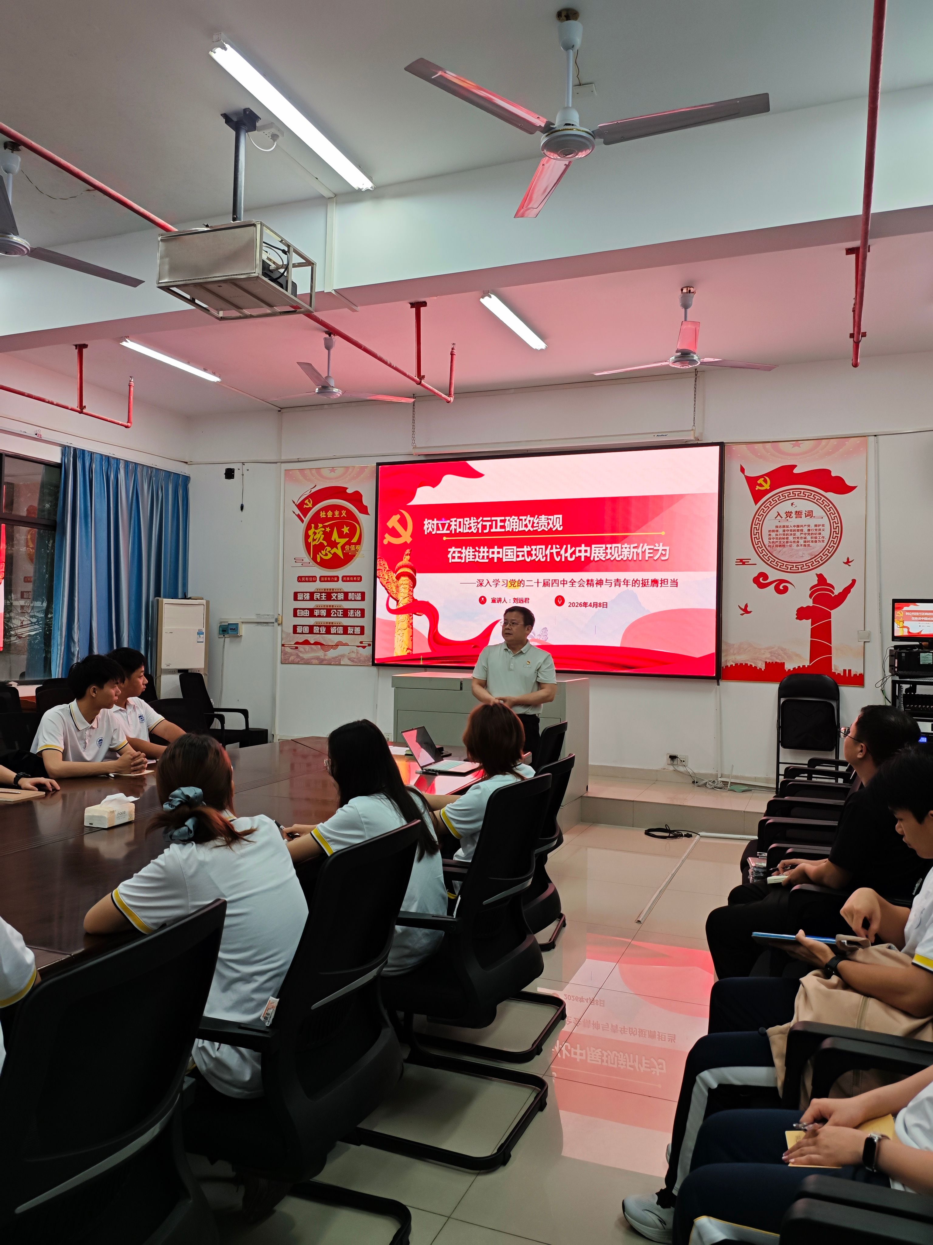 4月8日下午,学院党委书记刘远君以《树立和践行正确政绩观 在推进中国式现代化中展现新作为》为题,为2026年上半年入党积极分子授课。他以知识问答互动开篇,让党的二十届四中全会精神与“十五五”规划部署入脑入心。通过回顾“十四五”辉煌成就,刘远君引导同学们认识到,每一个“五年”都是国家奋进与人民拼搏的坚实足迹。他详细讲解《建议》的五个指导要求、六大原则、七个主要目标、十二项重大战略部署,强调落实全会精神必须在实干中树立和践行正确政绩观。他寄语环化学子,未来将投身教育、生态、产业、民生等关键领域,要从学生时代筑牢规矩意识,坚守干净、正直、担当的人生底色,以过硬本领与实干担当,在民族复兴伟业中书写青春答卷。