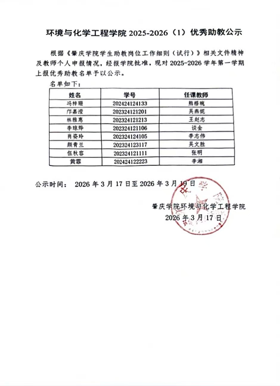 环化学院2025-2026学年上学期优秀助教公示